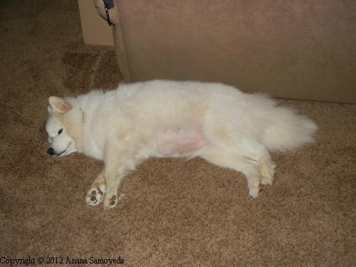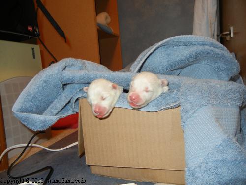 Mom and Dad trying out the whelping box for size. Denali likes the drop front, wonderful to use as a chin rest. Thanks to Beth Lockhart for the loan of the whelping box.