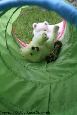 Tatiana, from Moonstar Samoyeds, having some fun with pups.