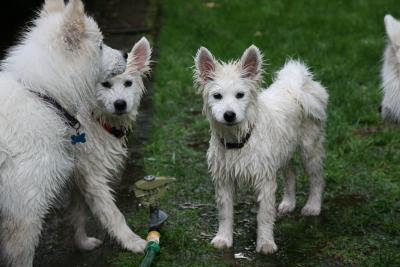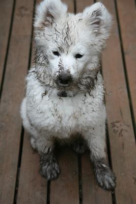 (08/29/12) |  |  | Tikaani with a liberal coat of mud applied. The latest in Samoyed fashion!